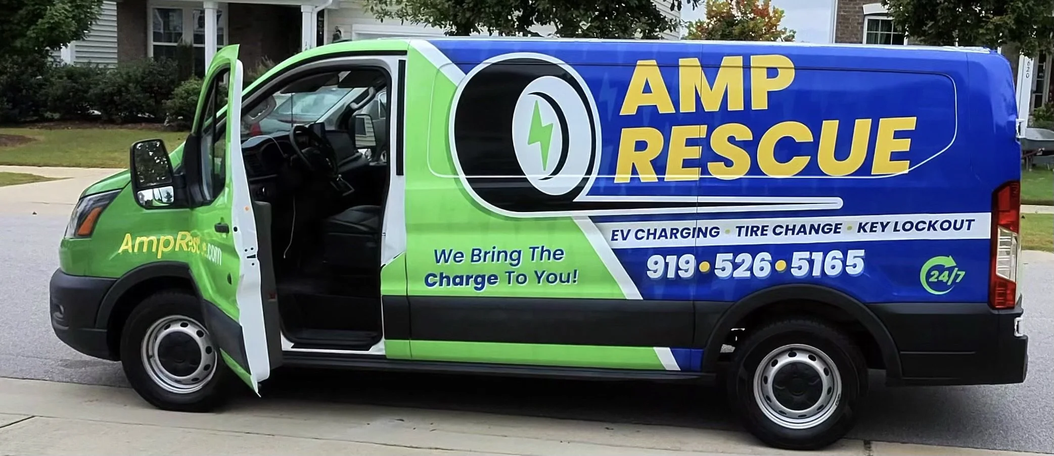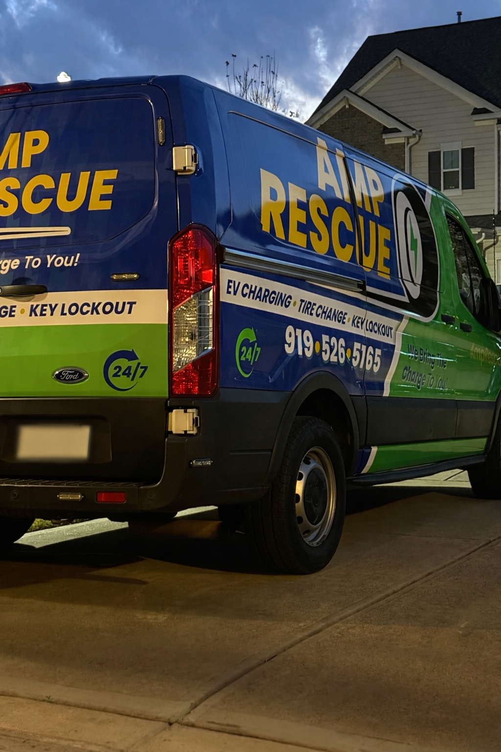 AmpRescue is NC Triangle's #1 mobile EV charging and roadside assistance service company. Flat tire patch or change, dead battery jump start, car lockout, fuel delivery, or EV out of charge. We come directly to your location in Raleigh, Wake Forest, Durham, Cary and surrounding areas, 24/7.